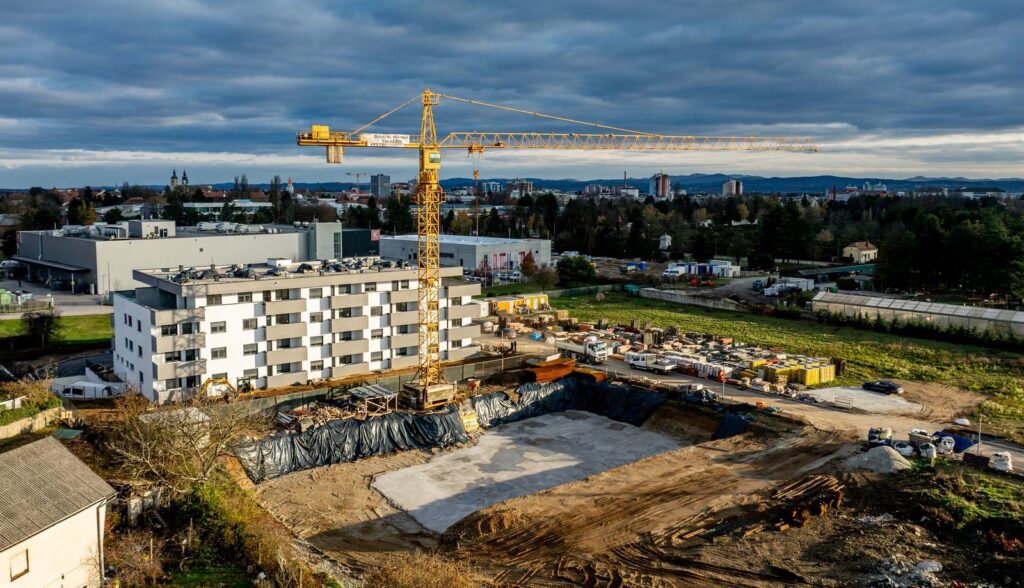 Istodobno, druga zgrada napreduje prema planu – iskop je dovršen, a gradilište aktivno radi.