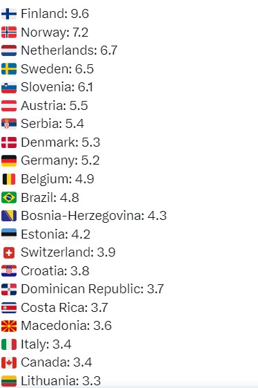 Slijede Norveška sa 7,2 kilograma, Nizozemska sa 6,7, Švedska sa 6,5 pa Slovenija sa 6,1.